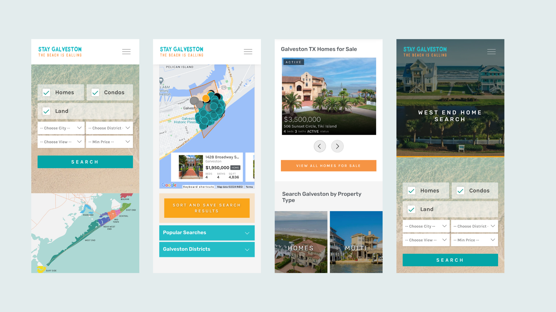 The other thing we needed to design was a completely, from scratch built search widget. This widget needed to guide the user through the Galveston market based on city, district, the specific view of the water, and a minimum price. The typical Real Geeks search experience wasn’t going to work — the final product works flawlessly.