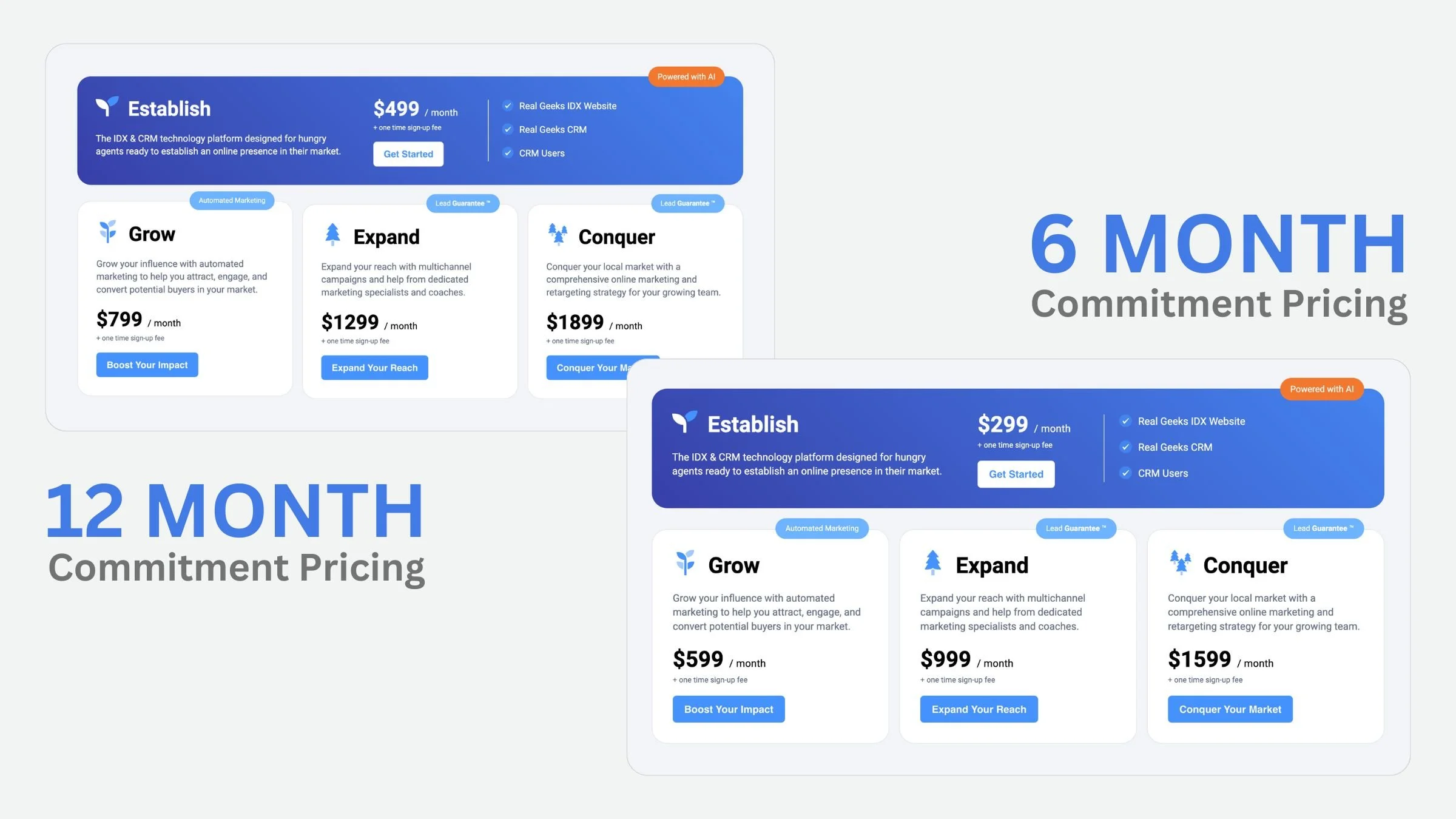 For 1-2 agents, the Establish Plan includes the core Real Geeks platform with a custom IDX website, CRM, and marketing tools to get your business up and running. You’ll have access to listing alerts, drip campaigns, and their Geek AI chatbot to engage new leads. This plan is best if you’re just starting out or have a small team.